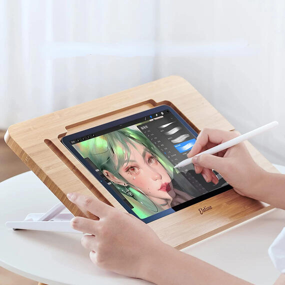 ELETIUO Upgraded Bamboo Wooden Drawing Ipad Holder with Pencil&Charger Cable Slot, Multi-Angle Adjustable